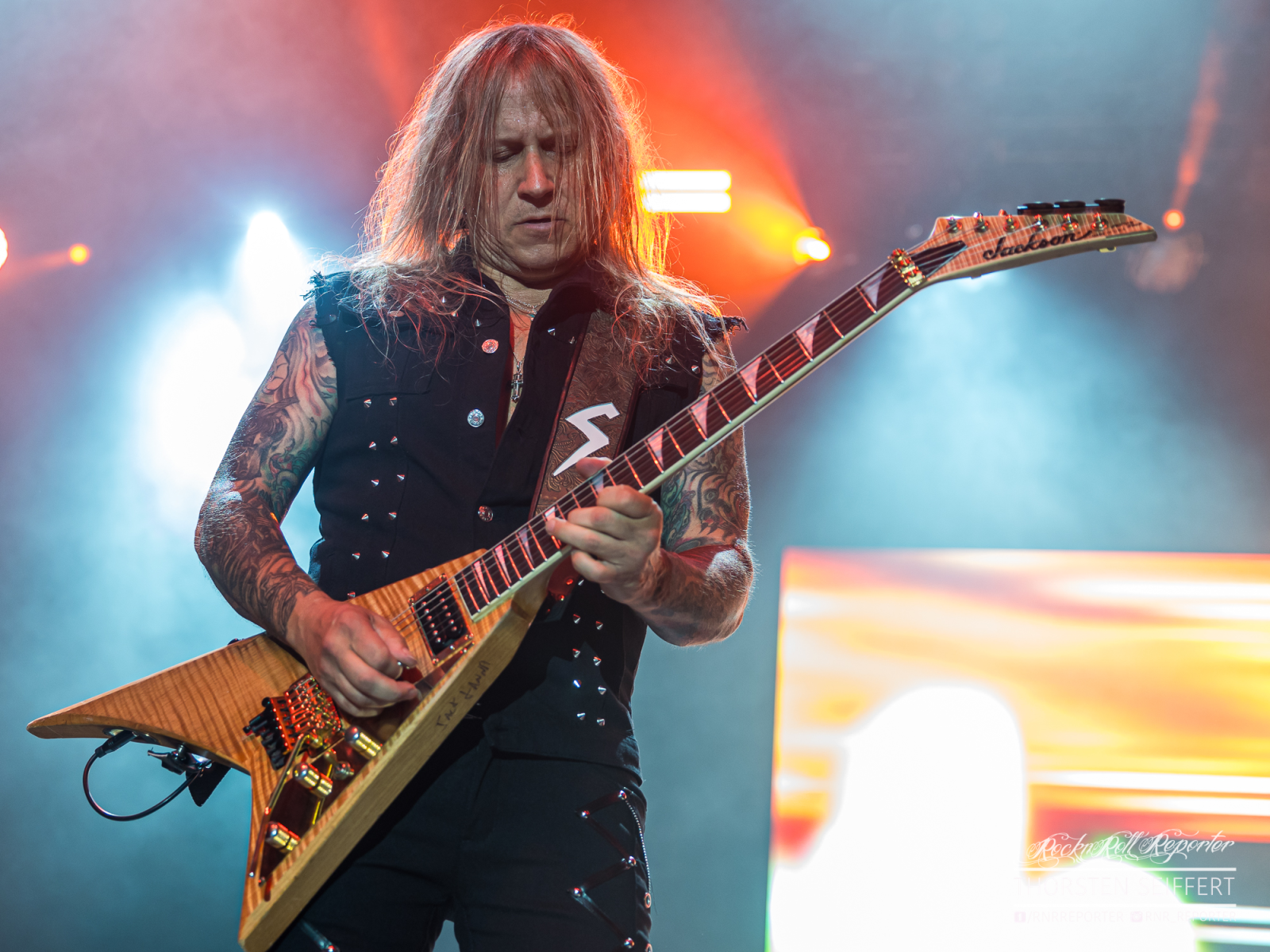 Spätestens bei „Dead Winter Dead“ und „The Hourglass“ biegt die Band auf die Zielgerade ein und startet die Schlussoffensive: Auf „Gutter Ballet“ und „Edge of Thorns“ scheint die Masse geradezu gewartet zu haben. Apropos gewartet: Einer fehlt. Jon Oliva, der Mastermind der Band, kann aus gesundheitlichen Gründen nicht mit der Band touren. Dennoch hat er einen Auftritt: In einem Video, das ihn am Piano zeigt, beginnt er mit „Believe“, dem zweiten Song, bei dem ich den Tränen mehr als nur nahe bin, die Band vollendet eindrucksvoll, während des Solos sehen wir Bilder des viel zu früh verstorbenen Criss Oliva, er erhält von der Menge in der Oberhausener Turbinenhalle Sonderapplaus.